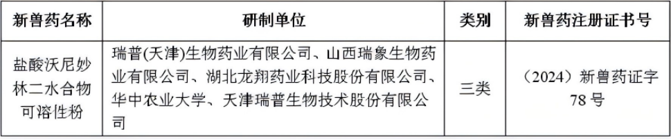 據2024年11月27日農業(yè)農村部網站發(fā)布的中華人民共和國農業(yè)農村部公告第848號,山西瑞象生物藥業(yè)有限公司與瑞普(天津)生物藥業(yè)有限公司等單位合作研發(fā)的“鹽酸沃尼妙林二水合物可溶性粉”獲批國家三類新獸藥證書。